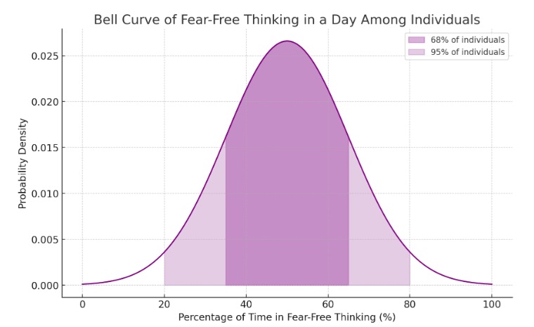 Here is a bell curve illustrating the distribution of time that individuals spend in fear-free thinking throughout the day. The curve is centered around 50%, with most people (68%) spending between 35% and 65% of their day in fear-free thought processes, while a wider range (95%) spends between 20% and 80% of their time in this state. The graph shows that while many people can achieve significant periods of fear-free thinking, only a smaller group maintains a high percentage of it consistently.